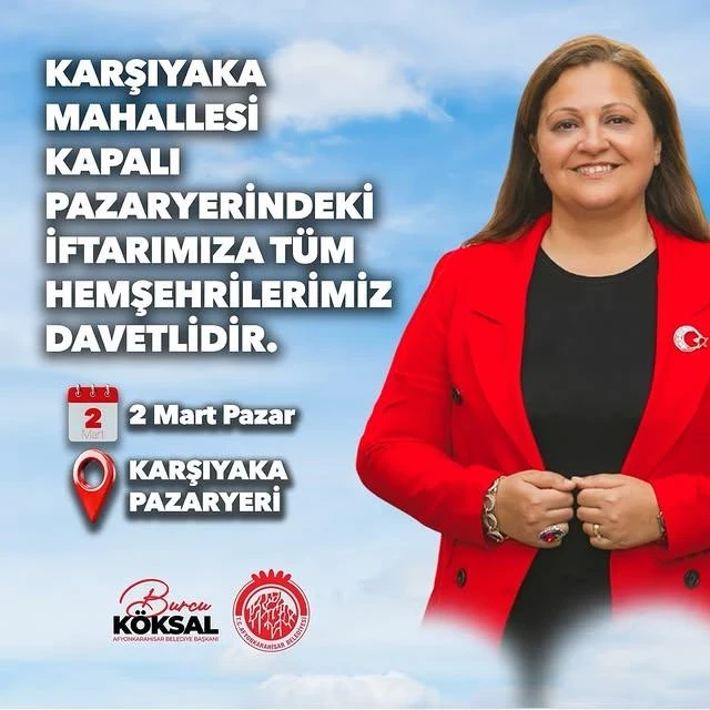 Afyonkarahisar Belediye Başkanı Burcu Köksal, yaklaşan ramazan ayı dolayısıyla tüm hemşehrilerini iftar yemeğine davet etti. Başkan Köksal'ın açıklamasına göre, iftar etkinliği 2 Mart Pazar günü Karşıyaka Pazaryeri’nde gerçekleşecek.