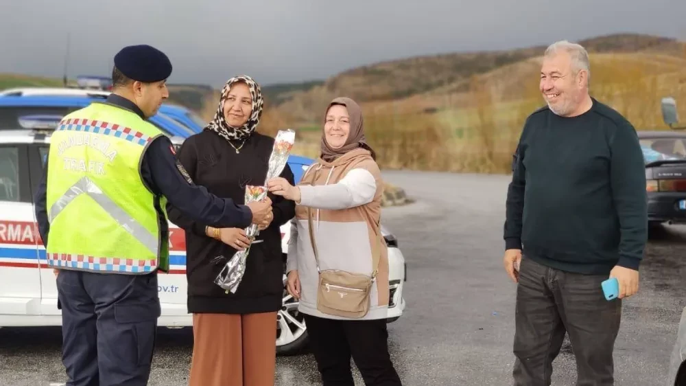 Kadın Kültür Evleri ile tarla ve bahçelerde çalışan kadınlar ile trafikte karşılaşılan kadın sürücüler ve yolcular, Jandarma ekiplerince durdurularak karanfil takdim edildi.