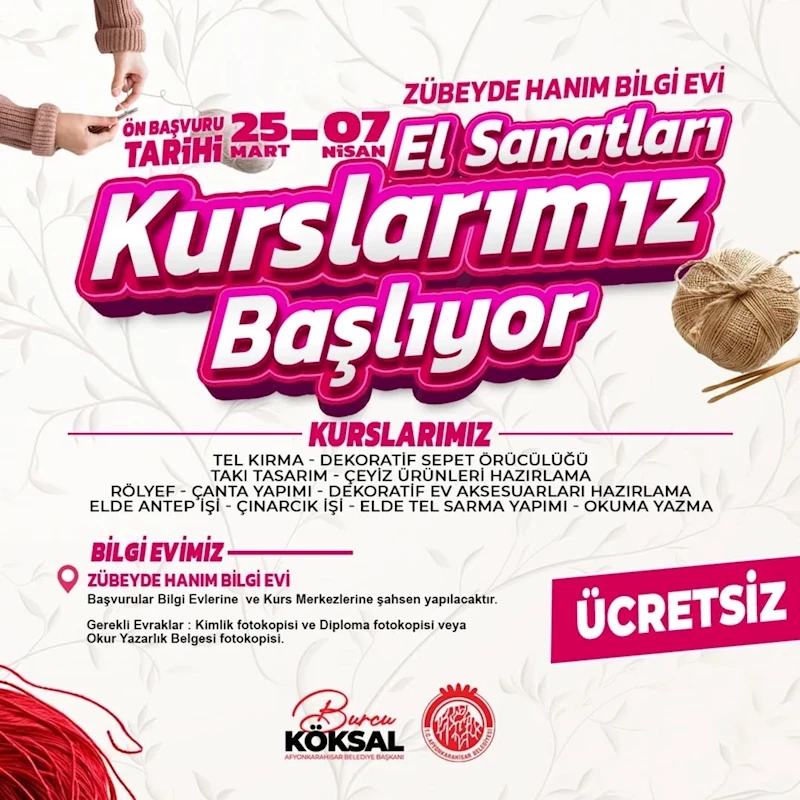 Afyonkarahisar Belediyesi, kadınların el becerilerini geliştirmeleri ve yeni gelir kaynakları oluşturmaları amacıyla ücretsiz el sanatları kursları düzenliyor. 25 Mart – 7 Nisan tarihleri arasında gerçekleştirilecek eğitimler, Zübeyde Hanım Bilgi Evi’nde yapılacak.