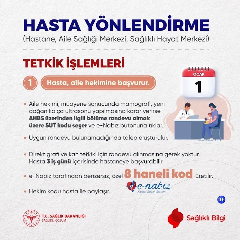 Aile hekimlerinin hastalarının tetkiklerini ikinci ve üçüncü basamak sağlık kuruluşlarından talep edebilmesi artık mümkün. Bu yeni düzenleme, hastaların sağlık sistemi içerisindeki işlemlerini kolaylaştırıyor. Hasta, e-Nabız kodu ile işlemleri başlatabilecek ve sonuçlar doğrudan aile hekiminin bildirim ekranına düşecek. Bu sayede, vatandaşlar herhangi bir ilave muayene gerekmeksizin tetkik işlemlerini hızlı ve etkili bir şekilde gerçekleştirebilecekler.