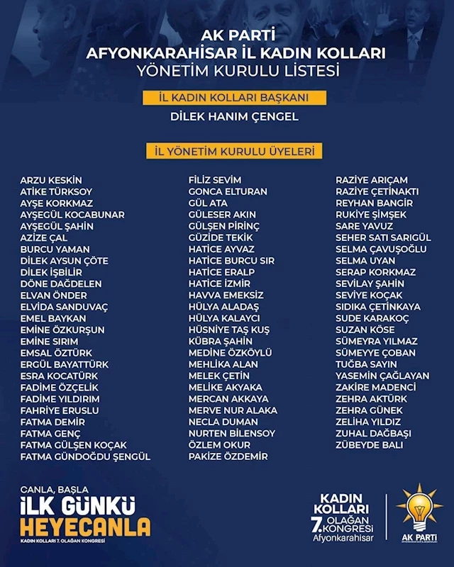 Kongrede seçilen yeni yönetim, "ilk günkü heyecanla" göreve başlayarak AK Parti'nin Afyonkarahisar'daki kadın kolları çalışmalarını daha da ileri taşımayı hedefliyor. Yönetim, kadınların parti politikalarına katkı sunması ve toplumda etkili rol alması için çeşitli projeler geliştirmeyi planlıyor.