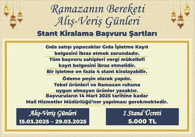 Stant kiralamak isteyen işletmelerin 14 Mart 2025 tarihine kadar Bolvadin Belediyesi Mali Hizmetler Müdürlüğü'ne müracaat etmeleri gerekiyor. İşletmeler bu tarihe kadar başvurarak, Ramazan'ın bereketini paylaşma fırsatı yakalayabilir.