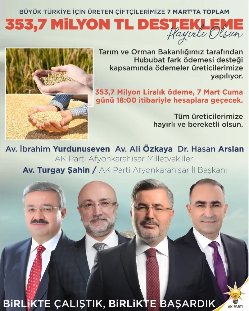 AK Parti Afyonkarahisar Milletvekilleri Av. İbrahim Yurdunuseven, Av. Ali Özkaya ve Dr. Hasan Arslan ile AK Parti Afyonkarahisar İl Başkanı Av. Turgay Şahin, yapılan desteklemenin üreticilere hayırlı ve bereketli olmasını diledi. Açıklamalarında, hükümetin tarım sektörüne verdiği önemi vurgulayarak, çiftçilere sağlanan desteklerin devam edeceğini belirttiler.