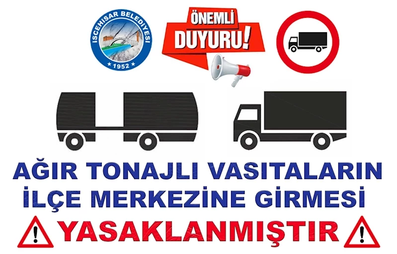 İscehisar Belediyesi, ilçede ağır tonajlı araçların izinsiz giriş ve park etmelerine yönelik yeni yasakları duyurdu. Yapılan açıklamaya göre ilçe merkezine izinsiz giriş yapan veya ticari amaçlı çalışan ağır yük araçlarının meskun mahalde bekleme yapmaları yasaklandı.