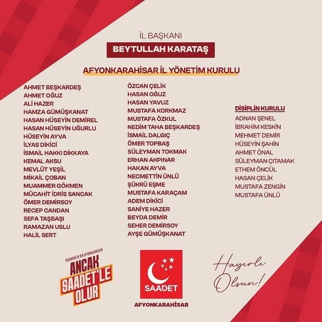 Saadet Partisi Afyonkarahisar İl Başkanlığı, 7. Olağan İl Kongresi'ni gerçekleştirerek yeni yönetim kurulunu oluşturdu. İl Başkanı Beytullah Karataş, kongrede yaptığı konuşmada, önceki dönemde görev yapan tüm başkanlara teşekkürlerini iletti ve yeni dönemde görev alacak başkanları tebrik etti. Karataş, "Önceki dönemde birlikte çalıştığımız tüm Başkanlarımıza teşekkür ediyor, yeni dönemde görev alan tüm Başkanlarımızı tebrik ediyorum. Hayırlı olsun," dedi. Kongrenin ardından yeni yönetim kurulu, önümüzdeki dönem için belirlenen yol haritası ve hedefler doğrultusunda çalışmalarına başlayacak.